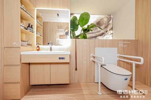 走到三代同堂与银发场景时,她特别留意到产品的适老化设计。三代同堂的透明气泡玻璃材质不仅干净易洁,更呼应了全家共处的通透氛围,无障碍设施的融入守护着团圆时刻;银发场景的老木水墨肌理传递着岁月温度,可升降智能马桶、适老化扶手、坐式淋浴器、可升降浴室柜等设计,让长者既能保持自主尊严,又能获得安全保障。