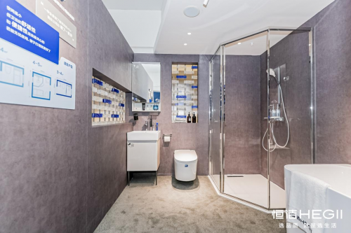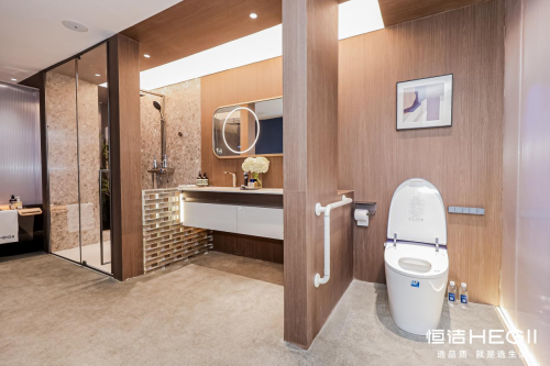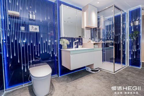 新智享场景则以“冰川群”为灵感,精准诠释了科技极简美学。瞩目的“进阶之梯”造型,既引导视觉动线又暗含恒洁技术进阶的理念。区域内,R、N、Q系列智能马桶错落陈列,墙面投影的“0”字格外醒目,直观呈现恒洁0冷水0等待、0距除菌、0压静音冲、0触翻盖等领先技术。